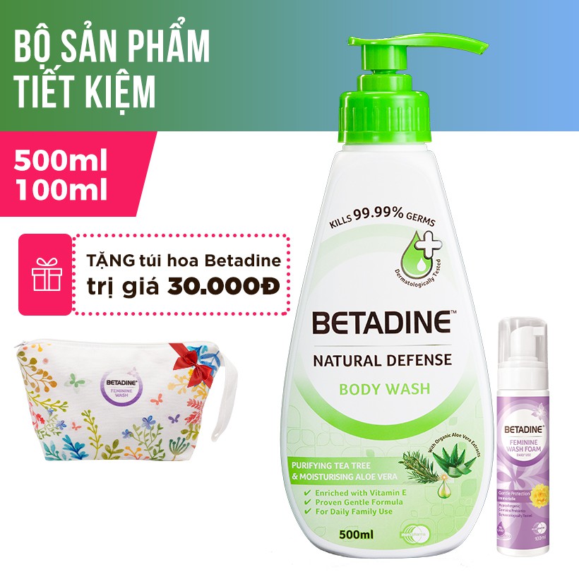 [GIẢM 30K - NHẬP MUNDI30C] Bộ sữa tắm trà xanh lô hội Betadine 500ml + Bọt vệ sinh phụ nữ Betadine 100ml (Tím)